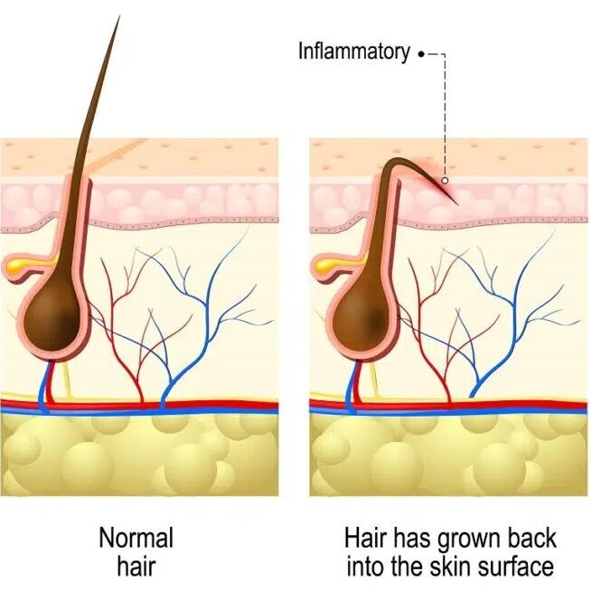 nepravilno britje ali depilacija: če se dlake ne odstranjujejo pravilno, lahko to povzroči, da se dlake zlomijo in zrastejo nazaj pod kožo;